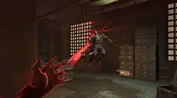 When the player is controlling Point Man, the sergeant, or Becket, gameplay is very similar, irrespective of which game is being played.[12][13][14][15] Common weaponry across all games includes handguns, assault rifles, submachine guns, shotguns, sniper rifles, nail guns, and rocket launchers. Other weapons available in the games include repeating cannons, particle beams, miniguns, laser carbines, grenade launchers, night vision rifles, lightning arcs, flamethrowers, pulse rifles, and machine pistols.[5][16][17][18][19] The player also has access to various projectiles. Frag genades are common across all games, whilst other types of projectiles include proximity grenades, remote bombs, deplyable turrets, incendiary grenades, shock grenades (electricity-based), flash bangs, and zap grenades (electricity-based).[13][17][20][21][22] Point Man, the sergeant, and Becket also have limited melee abilities; punch, kick, jumping kick, sliding tackle, and using the butts of their guns in hand-to-hand combat.[23][24][25] In F.E.A.R. 3, Point Man also has a knife for use in close combat.[26]