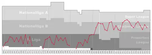 From the 2001–02 season, Vaduz played in the Swiss Challenge League (formerly called Nationalliga B), the second tier of the Swiss league system. Since then, Vaduz has remained one of the best-performing teams in the Challenge League and gave serious challenges towards promotion to the Super League, especially in 2004 and 2005, playing two-leg play-offs in both cases. In the 2007–08 season, Vaduz secured promotion to the Swiss Super League on 12 May 2008 by winning the Challenge League on the season's final day, giving Liechtenstein a representative at the highest level of Swiss football for the first time. Vaduz, however, was relegated back to the Challenge League after one season in the top flight. Vaduz finally returned to the top level after five years in the Challenge League.