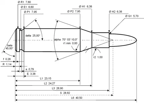 Americans define the shoulder angle at alpha/2 ≈ 35 degrees. The common rifling twist rate for this cartridge is 1:228.6 mm (1:9 in), 8 grooves, Ø lands = 5.53 mm, Ø grooves = 5.62 mm, land width = 1.63 mm and the recommended primer type is small rifle.[7]