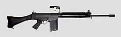 In 1950, the United Kingdom presented the redesigned FN rifle and the British EM-2, both in .280 British calibre, to the United States for comparison testing against the favoured United States Army design of the time—Earle Harvey's T25.[7] It was hoped that a common cartridge and rifle could be standardized for issue to the armies of all NATO member countries. After this testing was completed, U.S. Army officials suggested that FN should redesign their rifle to fire the U.S. prototype ".30 Light Rifle" cartridge. FN decided to hedge their bets with the U.S., and in 1951 even made a deal that the U.S. could produce FALs royalty-free, given that the UK appeared to be favouring their own EM-2. This decision appeared to be correct when the British Army decided to adopt the EM-2 (as Rifle No.9 Mk1) and the .280 British cartridge.[6]