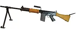 Also known as FALO as an abbreviation from the French Fusil Automatique Lourd, it had a heavy barrel for sustained fire with a 30-round magazine as a squad automatic weapon; Known in Canada as the C2A1, it was their primary squad automatic weapon until it was phased out during the 1980s in favor of the C9, which has better accuracy and higher ammunition capacity than the C2. In the Australian Army, as the L2A1, it was their primary squad automatic weapon in the 1960s. However it was generally disliked and replaced by the F89 Minimi in the late 1980s. The L2A1 or 'heavy barrel' FAL was used by several Commonwealth nations and was found to frequently experience a failure to feed after firing two rounds from a full magazine when in automatic mode. The 50.41 is fitted with a synthetic buttstock, while the 50.42's buttstock is made from wood.
