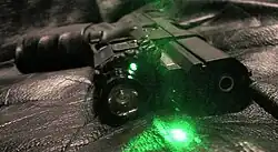 The Five-seven can be used in conjunction with a wide range of firearm accessories; holsters are offered by various manufacturers, and the pistol's MIL-STD-1913 (Picatinny) accessory rail will accept tactical lights or laser aiming devices.[8][44] With the use of an extended, threaded barrel, the pistol can also be fitted with various sound suppressors developed by Advanced Armament Corporation, Gemtech, Silencerco, and other manufacturers. The Gemtech SFN-57, which was developed in 1998 specifically for use with the Five-seven, is a matte black aluminum suppressor with a length of 147 mm (5.8 in), a diameter of 32 mm (1.3 in), and a weight of 147 g (0.324 lb).[22][45] Israeli manufacturer FAB Defense offers a complete PDW conversion kit for the Five-seven, designated the KPOS G2 FN 5.7, that allows the pistol to be reconfigured into a shoulder-fired personal defense weapon, and CornerShot offers a weapon system compatible with the Five-seven that allows the shooter to aim and fire around corners without being exposed.[46][47]