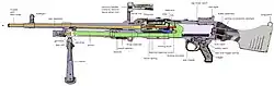 The MAG Model 60-20 is an automatic, air-cooled, gas-operated machine gun, firing belt-fed 7.62×51mm NATO from an open bolt. The MAG uses a series of proven design concepts from other successful firearms, for example the locking mechanism is modeled on that of the Browning M1918 (BAR) automatic rifle, which FN produced under license with some adaptions, and the feed and trigger mechanisms are from the WW II-era MG 42 universal machine gun.[13]