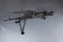 The quick-change barrel has a slotted flash suppressor. The barrel's chamber and bore are chrome-lined or stellite-lined for increased service life and the barrel has four right-hand grooves with a 305 mm (1:12 in) rifling twist rate. Also attached to the barrel is the front sight base, carry handle and gas block (equipped with an exhaust-type gas regulator valve with three settings).[13][14][15] The barrel assembly weighs 3,050 g (6.72 lb) and of the 630 mm (24.80 in) long barrel a portion of 487.5 mm (19.19 in) is rifled.[16] The MAG takes zero shifts between barrel assemblies into account by making the front sight of the assemblies adjustable with the help of tools.
