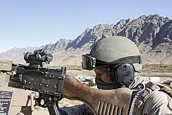 The L7A2, general-purpose machine gun, replaced the L7A1 in service with the British Army. Compared to the MAG Model 60-20, it features, among other minor changes, an improved feed mechanism, a 10-position gas regulator valve, a polymer butt-stock, a provision for 50 round belt-box and a bracket, used to mount optical day- and night-vision sights, mounted to the left side of the receiver. In the sustained fire role, the L7A2 can be mounted on the L4A1 tripod in conjunction with a C2A2 Support Weapons Sight or the sight unit used on the FGM-148 Javelin anti-tank missile system. Fired by a two-man team who are grouped in a specialist Machine Gun Platoon the L7A2 in conjunction with a C2A2 Support Weapons Sight can provide battalion-level direct support fire at ranges up to 1,800 m (1,969 yd) and indirect map and range table predicted support/harassment fire out to 2,500 m (2,734 yd). The indirect firing method exploits the 7.62×51mm NATO useful maximum range, that is defined by the maximum range of a small-arms projectile while still maintaining the minimum kinetic energy required to put unprotected personnel out of action, which is generally believed to be 15 kilogram-meters (147 J / 108 ft⋅lbf).[30] With the tripod and FGM-148 Javelin sight unit indirect fire configuration, British troops in Afghanistan used the L7A2 at ranges of and over 2,700 m (2,953 yd).[31] The average 1,884 m (6,181 ft)[32] elevation of Afghanistan and accompanying low ISA air density[33] significantly contribute to extending the useful maximum range of small-arms projectiles.