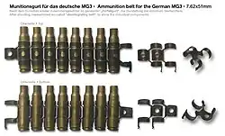 The weapon feeds from the left side from open-link, metal ammunition belts: either the American disintegrating M13 linked belt (NATO standard) or the non-disintegrating segmented German DM1 belt, whose 50-round sections can be linked through a cartridge. The DM1 belt is based on the last version of the Gurt 34/41-family used in World War II in MG 34 and MG 42 machine guns.[17] After firing, the separated M13 link or emptied DM1 belt section is cleared out on the right side of the receiver through an ejection port normally covered by a spring-loaded dust cover.[13]