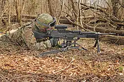 The C6 was first used in Canada for use as a coaxial MG in the Leopard C1 main battle tank. Since then, it has been used in the Canadian Forces with the designation the C6 GPMG,[34] it is used primarily as a platoon level support weapon.[35] One C6 machine gun is assigned to each Rifle platoon. The C6 GPMG is also mounted on a variety of vehicles, including the G-Wagon LUVW, LAV 6.0, TAPV, Leopard 2, and CH-146 Griffon helicopter. In these vehicles, the C6 GPMGs are co-axially and pintle-mounted and used to provide fire support to the infantry or for local defence of the vehicle itself. On the TAPV and LAV 6 ACSV, the C6 can be mounted on an RWS platform. In September 2018, Canada began fielding an improved C6A1 FLEX version; changes include a polymer buttstock which is more durable and easier to decontaminate in a CBRN scenario than the original wooden stock, M1913 picatinny rails for the attachment of pointing devices and optical sighting systems, and an adjustable gas tube regulator to control the rate of fire.[36][37][38][39][40][41] The C6A1 is manufactured by Colt Canada, with the company having earlier provided support for the original C6 fleet, and is the first support machine gun to have been manufactured in Canada since the Second World War.[38]