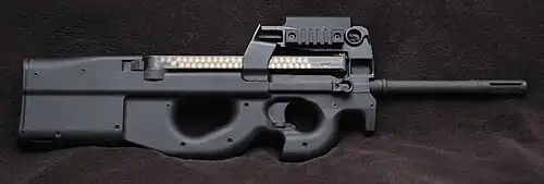Further development of the P90 led to the creation of the P90 TR model, which has a MIL-STD-1913 (Picatinny) triple rail interface for mounting accessories.[16] This model was introduced in late 1999 and continues to be offered alongside the standard P90.[16] More recently, the P90 has been offered to civilian shooters as the PS90, a semi-automatic carbine intended for personal protection and sporting use.[21]
