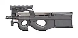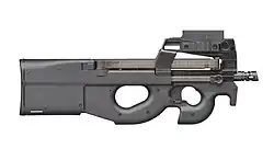 The FN P90 is a personal defense weapon chambered for the 5.7×28mm cartridge, also classified as a submachine gun, designed and manufactured by FN Herstal in Belgium.[9][10][11] Created in response to NATO requests for a replacement for 9×19mm Parabellum firearms, the P90 was designed as a compact but powerful firearm for vehicle crews, operators of crew-served weapons, support personnel, special forces, and counter-terrorist groups.