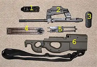 The P90 requires minimal maintenance, and it can be disassembled quickly and easily.[7][23] It is a modular firearm, consisting of four main component groups: the barrel and optical sight group, the moving parts group, the frame and trigger group, and the hammer group. The P90's barrel is cold hammer-forged and chrome-lined, with an overall length of 263 mm (10.4 in).[8] The barrel has eight rifling grooves with a right-hand twist rate of 1:231 mm (1:9.1 in), and it is equipped with a diagonally cut flash suppressor that also acts as a recoil compensator.[7][8] The stated service life of the barrel is 20,000 rounds.[10]