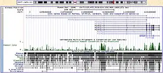 Human FOXP2 gene and evolutionary conservation is shown in a multiple alignment (at bottom of figure) in this image from the UCSC Genome Browser. Note that conservation tends to cluster around coding regions (exons).