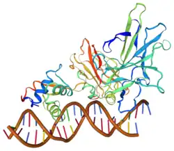 In 2001, the team identified in CS that the mutation is in the middle of a protein-coding gene.[7] Using a combination of bioinformatics and RNA analyses, they discovered that the gene codes for a novel protein belonging to the forkhead-box (FOX) group of transcription factors. As such, it was assigned with the official name of FOXP2. When the researchers sequenced the FOXP2 gene in the KE family, they found a heterozygous point mutation shared by all the affected individuals, but not in unaffected members of the family and other people.[7] This mutation is due to an amino-acid substitution that inhibits the DNA-binding domain of the FOXP2 protein.[73] Further screening of the gene identified multiple additional cases of FOXP2 disruption, including different point mutations[8] and chromosomal rearrangements,[74] providing evidence that damage to one copy of this gene is sufficient to derail speech and language development.
