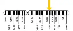 In 1998, Oxford University geneticists Simon Fisher, Anthony Monaco, Cecilia S. L. Lai, Jane A. Hurst, and Faraneh Vargha-Khadem identified an autosomal dominant monogenic inheritance that is localized on a small region of chromosome 7 from DNA samples taken from the affected and unaffected members.[5] The chromosomal region (locus) contained 70 genes.[72] The locus was given the official name "SPCH1" (for speech-and-language-disorder-1) by the Human Genome Nomenclature committee. Mapping and sequencing of the chromosomal region was performed with the aid of bacterial artificial chromosome clones.[6] Around this time, the researchers identified an individual who was unrelated to the KE family but had a similar type of speech and language disorder. In this case, the child, known as CS, carried a chromosomal rearrangement (a translocation) in which part of chromosome 7 had become exchanged with part of chromosome 5. The site of breakage of chromosome 7 was located within the SPCH1 region.[6]