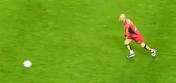 In addition to his shot-stopping abilities,[8][74][77][82] Barthez was also known to be a passionate, popular, and highly recognisable footballing figure,[6][57][76][83] who stood out for his outgoing personality, self-assurance, and composure under pressure, as well as his leadership from the back and authoritative presence in goal.[8][15][17][53][68][73][75][76][83] Furthermore, Barthez was highly regarded for his exceptional skills with the ball at his feet, as well as his accurate distribution with his left foot, which enabled him to play the ball out from the back or launch an attack with his quick throws or long goal kicks; his confidence in possession often led him to be involved in the build-up of plays, and he often operated outside the penalty area, and would even occasionally attempt to dribble with the ball past opposing strikers with feints such as nutmegs or stepovers. He was also very quick off his line, and often acted as a sweeper-keeper, thus contributing to the evolution of the role.[6][8] While he received plaudits for his goalkeeping ability in the media, throughout his career Barthez also frequently came under criticism from pundits for his stubbornness, and his aggressive, unorthodox and eccentric style of play, as well as for taking unnecessary risks; he was also deemed to be inconsistent, unreliable and prone to errors and lapses in concentration.[6][15][57][68][74][76][77][82][83][84][85][86]