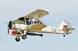 The Fairey Swordfish was a medium-sized biplane torpedo bomber and reconnaissance aircraft with a fabric-covered metal airframe. It had folding wings. In service, it received the nickname Stringbag; this was not due to its profusion of struts, spars, and braces, but a reference to the seemingly endless variety of stores and equipment that the type was cleared to carry. Crews likened the aircraft to a housewife's string shopping bag, common at the time and which could accommodate contents of any shape.[11]