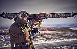 The genus Aquila (all have "booted" or feathered tarsi) has a nearly worldwide distribution. The more powerful types are used in falconry; for example golden eagles (A. chrysaetos) have reportedly been used to hunt wolves[11] in Kazakhstan, and are now most widely used by the Altaic Kazakh eagle hunters in the western Mongolian province of Bayan-Ölgii to hunt foxes,[12][13][14][15][16] and other large prey, as they are in neighbouring Kyrgyzstan.[17] Most are primarily ground-oriented, but occasionally take birds. Eagles are not used as widely in falconry as other birds of prey, due to the lack of versatility in the larger species (they primarily hunt over large, open ground), the greater potential danger to other people if hunted in a widely populated area, and the difficulty of training and managing an eagle. A little over 300 active falconers are using eagles in Central Asia, with 250 in western Mongolia, 50 in Kazakhstan, and smaller numbers in Kyrgyzstan and western China.[15]