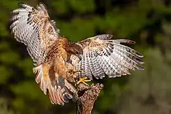 • "Broadwings": Buteo and Parabuteo spp., and eagles (red-tailed hawks, Harris's hawks, golden eagles)