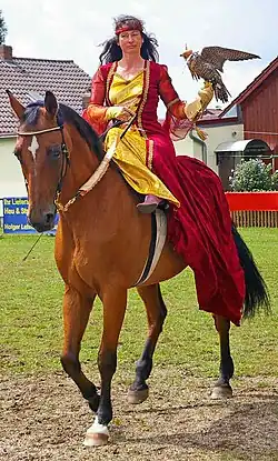 In early English falconry literature, the word "falcon" referred to a female peregrine falcon only, while the word "hawk" or "hawke" referred to a female hawk. A male hawk or falcon was referred to as a "tiercel" (sometimes spelled "tercel"), as it was roughly one-third less than the female in size.[1][2] This traditional Arabian sport grew throughout Europe. Falconry is also an icon of Arabian culture. The saker falcon used by Arabs for falconry is called by Arabs "Hur" i.e. Free-bird, and it has been used in falconry in the Arabian Peninsula since ancient times. Saker falcons are the national bird of the United Arab Emirates, Saudi Arabia, Qatar, Oman and Yemen and have been integral to Arab heritage and culture for over 9,000 years. They are the national emblem of many Arab countries.[3][4]