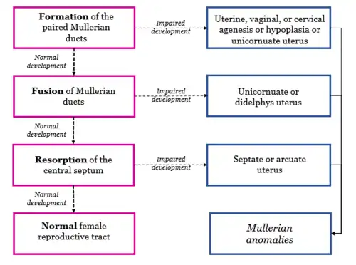 Embryos develop a genital ridge that forms at their tail end and eventually forms the basis for the urinary system and reproductive tracts. Either side and to the front of this tract, around the sixth week develops a duct called the paramesonephric duct, also called the Müllerian duct.[17] A second duct, the mesonephric duct, develops adjacent to this. Both ducts become longer over the next two weeks, and the paramesonephric ducts around the eighth week cross to meet in the midline and fuse.[17] One duct then regresses, with this depending on whether the embryo is genetically female or male. In females, the paramesonephric duct remains, and eventually forms the female reproductive tract.[17] The portions of the paramesonephric duct, which are more cranial—that is, further from the tail-end, end up forming the fallopian tubes.[17] In males, because of the presence of the Y sex chromosome, anti-Müllerian hormone is produced. This leads to the degeneration of the paramesonephric duct.[17]