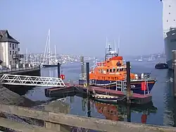 The Falmouth Docks were developed from 1858,[18] and the Royal National Lifeboat Institution (RNLI) opened Falmouth Lifeboat Station nearby in 1867. The present building dates from 1993 and also houses HM Coastguard.[19] The RNLI operates two lifeboats from Falmouth: Richard Cox Scott, a 17-metre (56 ft) Severn-class all-weather boat,[20] and B-916 Robina Nixon Chard, an Atlantic 85 inshore lifeboat.
