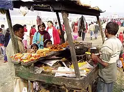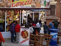 In the cities of Roman antiquity, much of the urban population living in insulae, multi-story apartment blocks, depended on food vendors for many of their meals; the Forum itself served as a marketplace where Romans could purchase baked goods and cured meats.[14] In the mornings, bread soaked in wine was eaten as a quick snack and cooked vegetables and stews later in popina, a simple type of eating establishment.[15] In Asia, 12th-century Chinese ate fried dough, soups and stuffed buns, all of which still exist as contemporary snack food.[16] Their Baghdadi contemporaries supplemented home-cooked meals with processed legumes, purchased starches, and even ready-to-eat meats.[17] During the Middle Ages, large towns and major urban areas such as London and Paris supported numerous vendors that sold dishes such as pies, pasties, flans, waffles, wafers, pancakes and cooked meats. As in Roman cities during antiquity, many of these establishments catered to those who did not have means to cook their own food, particularly single households. Unlike richer town dwellers, many often could not afford housing with kitchen facilities and thus relied on fast food. Travelers such as pilgrims en route to a holy site, were among the customers.[18]