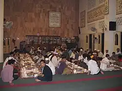 In Islam, fasting (called ṣawm[1] in Arabic: صَوم [sˤɑwm], or ṣiyām صيام [sˤɪˈjæːm]) is the practice of abstaining from food, drink, sexual activity, and anything that substitutes food and drink. During the holy month of Ramadan, fasting is observed between dawn and sunset when the prayer call of the dawn prayer and the sunset prayer is called.[2] Ramadan is the ninth month of the Muslim lunar calendar and fasting is a requirement for able Muslims as it is the fourth of the five pillars of Islam.[3]