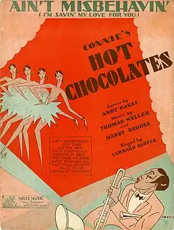 1929 saw the composition of some of Waller's most highly-regarded songs, such as "Ain't Misbehavin'" (for the revue Hot Chocolates), "I've Got a Feeling I'm Falling", "Honeysuckle Rose" (for the revue Load of Coal), and "Black and Blue".[39][40] To avoid having to pay more in child support to Edith, whom he had divorced in 1923, Waller sold the rights for twenty of his songs (including "Ain't Misbehavin'") to Irving Mills for $500. This was a small fraction of their value.[41][42] As a consequence he earned only the musician's share of the royalties from the subsequent recordings.[43]