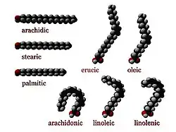 - ^ Each double bond in the fatty acid is indicated by Δx, where the double bond is located on the xth carbon–carbon bond, counting from the carboxylic acid end.