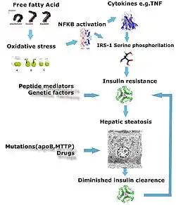 23. ^ Medina J, Fernández-Salazar LI, García-Buey L, Moreno-Otero R (August 2004). "Approach to the pathogenesis and treatment of nonalcoholic steatohepatitis". Diabetes Care. 27 (8): 2057–66. doi:10.2337/diacare.27.8.2057. PMID 15277442.