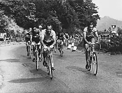 In 1952, Coppi started again in the Tour. He won on the Alpe d'Huez, which had been included for the first time that year. He attacked six kilometres from the summit to rid himself of the French rider, Jean Robic. Coppi said: "I knew he was no longer there when I couldn't hear his breathing any more or the sound of his tyres on the road behind me".[14][15] He rode like "a Martian on a bicycle", said Raphaël Géminiani. "He asked my advice about the gears to use, I was in the French team and he in the Italian, but he was a friend and normally my captain in our everyday team, so I could hardly refuse him. I saw a phenomenal rider that day".[16] Coppi won the Tour by 28m 27s and the organiser, Jacques Goddet, had to double the prizes for lower placings to keep other riders interested.[17] It was his last Tour, having ridden three and won two. To conserve energy, he would have soigneurs carry him around his hotel during Grand Tours.[18]