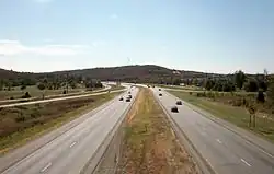 According to the United States Census Bureau, the city has a total area of 55.2 square miles (143 km2), of which 53.8 square miles (139 km2) is land and 1.4 square miles (3.6 km2) (2.59%) is water. The city is centrally located in Washington County, Arkansas, along Interstate 49/US Route 71,[23] the only fully controlled access route through the area, which replaced the winding US 71 (now US 71B) in the 1990s.[24] An interstate connection with Fort Smith to the south and Kansas City, Missouri, to the north has contributed to Fayetteville's growth. Fayetteville is bordered along the north by Springdale and Johnson. In places, this transition is seamlessly urban. Fayetteville is not bordered by towns to its south, instead opening up to scenic country along the Boston Mountains Scenic Loop.[25] Past the rural communities of Greenland and West Fork is Devil's Den State Park.[24] To the west is Farmington along US Route 62 and to the east of Fayetteville is undeveloped land in rural Washington County.[24]