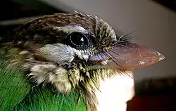 Bristles are stiff, tapering feathers with a large rachis but few barbs. Rictal bristles are found around the eyes and bill. They may serve a similar purpose to eyelashes and vibrissae in mammals. Although there is as yet no clear evidence, it has been suggested that rictal bristles have sensory functions and may help insectivorous birds to capture prey.[26] In one study, willow flycatchers (Empidonax traillii) were found to catch insects equally well before and after removal of the rictal bristles.[27]