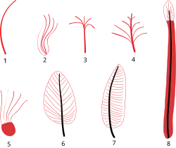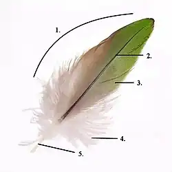There are two basic types of feather: vaned feathers which cover the exterior of the body, and down feathers which are underneath the vaned feathers. The pennaceous feathers are vaned feathers. Also called contour feathers, pennaceous feathers arise from tracts and cover the entire body. A third rarer type of feather, the filoplume, is hairlike and are closely associated with pennaceous feathers and are often entirely hidden by them, with one or two filoplumes attached and sprouting from near the same point of the skin as each pennaceous feather, at least on a bird's head, neck and trunk.[14][15] Filoplumes are entirely absent in ratites.[16] In some passerines, filoplumes arise exposed beyond the pennaceous feathers on the neck.[1] The remiges, or flight feathers of the wing, and rectrices, or flight feathers of the tail, are the most important feathers for flight. A typical vaned feather features a main shaft, called the rachis. Fused to the rachis are a series of branches, or barbs; the barbs themselves are also branched and form the barbules. These barbules have minute hooks called barbicels for cross-attachment. Down feathers are fluffy because they lack barbicels, so the barbules float free of each other, allowing the down to trap air and provide excellent thermal insulation. At the base of the feather, the rachis expands to form the hollow tubular calamus (or quill) which inserts into a follicle in the skin. The basal part of the calamus is without vanes. This part is embedded within the skin follicle and has an opening at the base (proximal umbilicus) and a small opening on the side (distal umbilicus).[17]