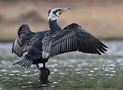 Some birds have a supply of powder down feathers that grow continuously, with small particles regularly breaking off from the ends of the barbules. These particles produce a powder that sifts through the feathers on the bird's body and acts as a waterproofing agent and a feather conditioner. Powder down has evolved independently in several taxa and can be found in down as well as in pennaceous feathers. They may be scattered in plumage, as in the pigeons and parrots, or in localized patches on the breast, belly, or flanks, as in herons and frogmouths. Herons use their bill to break the powder down feathers and to spread them, while cockatoos may use their head as a powder puff to apply the powder.[24] Waterproofing can be lost by exposure to emulsifying agents due to human pollution. Feathers can then become waterlogged, causing the bird to sink. It is also very difficult to clean and rescue birds whose feathers have been fouled by oil spills. The feathers of cormorants soak up water and help to reduce buoyancy, thereby allowing the birds to swim submerged.[25]