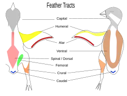 Contour feathers are not uniformly distributed on the skin of the bird except in some groups such as the penguins, ratites and screamers.[29] In most birds the feathers grow from specific tracts of skin called pterylae; between the pterylae there are regions which are free of feathers called apterylae (or apteria). Filoplumes and down may arise from the apterylae. The arrangement of these feather tracts, pterylosis or pterylography, varies across bird families and has been used in the past as a means for determining the evolutionary relationships of bird families.[30][31] Species that incubate their own eggs often lose their feathers on a region of their belly, forming a brooding patch.[32]