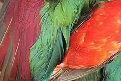 Left: turacin (red) and turacoverdin (green, with some structural blue iridescence at lower end) on the wing of Tauraco bannermani