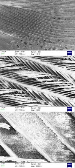 Feathers are epidermal growths that form a distinctive outer covering, or plumage, on both avian (bird) and some non-avian dinosaurs and other archosaurs. They are the most complex integumentary structures found in vertebrates[1][2] and an example of a complex evolutionary novelty.[3] They are among the characteristics that distinguish the extant birds from other living groups.[4]