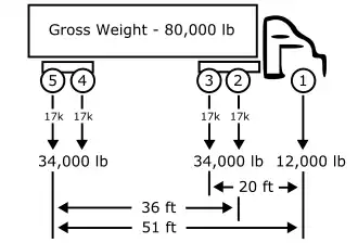In effect, the formula reduces the legal weight limit for shorter trucks with fewer axles (see table below). For example, a 25-foot (7.6 m) three-axle dump truck would have a gross weight limit of 54,500 pounds (24,700 kg), instead of 80,000 pounds (36,000 kg), which is the standard weight limit for 63-foot (19.2 m) five-axle tractor-trailer.[1] FHWA regulation §658.17 states: "The maximum gross vehicle weight shall be 80,000 pounds (36,000 kg) except where lower gross vehicle weight is dictated by the bridge formula."[9]