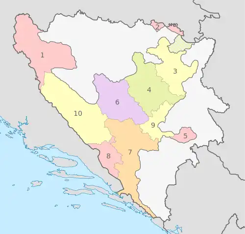 The Federation of Bosnia and Herzegovina comprises ten cantons (Bosnian: kantoni, Croatian: županije):
