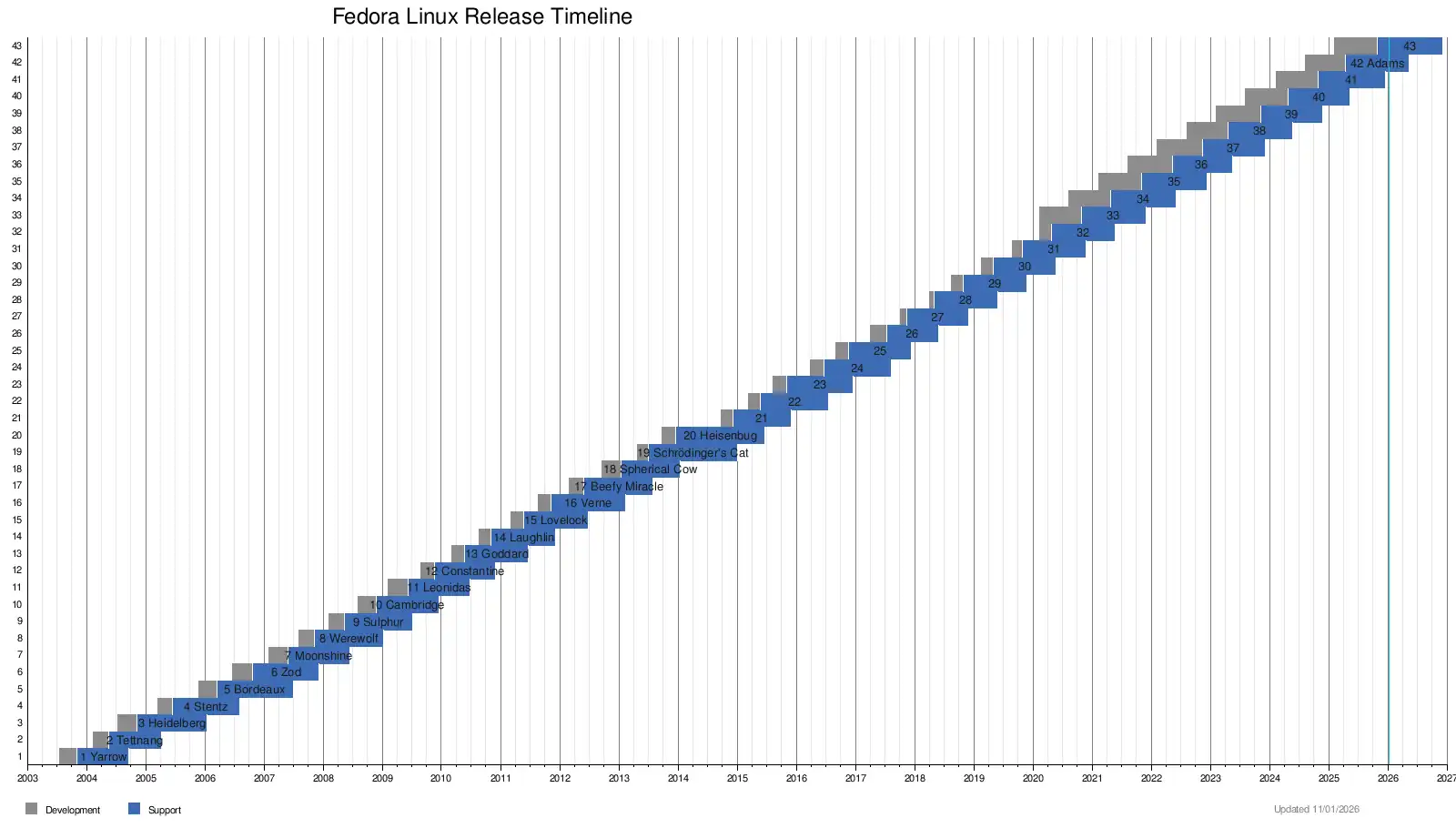 101. ^ a b "Fedora Linux 44 Schedule". Fedora Project.
