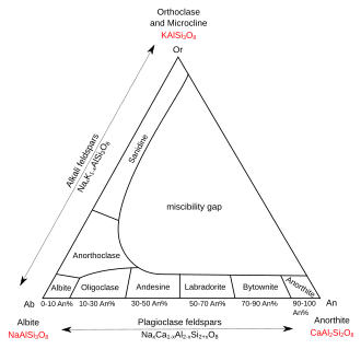 Solid solutions between orthoclase and albite are called alkali feldspar.[14] Solid solutions between albite and anorthite are called plagioclase,[14] or, more properly, plagioclase feldspar. Only limited solid solution occurs between K-feldspar and anorthite, and in the two other solid solutions, immiscibility occurs at temperatures common in the crust of the Earth. Albite is considered both a plagioclase and an alkali feldspar.