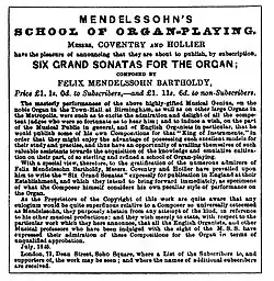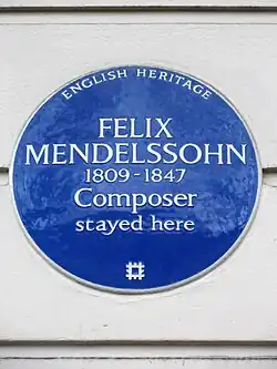 Mendelssohn first visited Britain in 1829, where Moscheles, who had already settled in London, introduced him to influential musical circles. In the summer he visited Edinburgh, where he met among others the composer John Thomson, whom he later recommended for the post of professor of music at Edinburgh University.[64] He made ten visits to Britain, lasting altogether about 20 months; he won a strong following, which enabled him to make a good impression on British musical life.[65] He composed and performed, and also edited for British publishers the first critical editions of oratorios of Handel and of the organ music of J. S. Bach. Scotland inspired two of his most famous works: the overture The Hebrides (also known as Fingal's Cave); and the Scottish Symphony (Symphony No. 3).[66] An English Heritage blue plaque commemorating Mendelssohn's residence in London was placed at 4 Hobart Place in Belgravia, London, in 2013.[67]