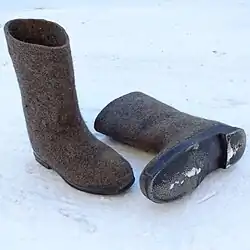 During the 18th and 19th centuries gentlemen's headwear made from beaver felt were popular.[26][31][32] In the early part of the 20th century, cloth felt hats, such as fedoras, trilbies[33] and homburgs,[34] were worn by many men in the western world. Felt is often used in footwear as boot liners, with the Russian valenki being an example.[35][36]