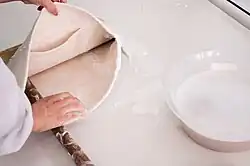 In the wet felting process, hot water is applied to layers of animal hairs, while repeated agitation and compression causes the fibers to hook together or weave together into a single piece of fabric.[14][8] Wrapping the properly arranged fiber in a sturdy, textured material, such as a bamboo mat or burlap, will speed up the felting process. The felted material may be finished by fulling.