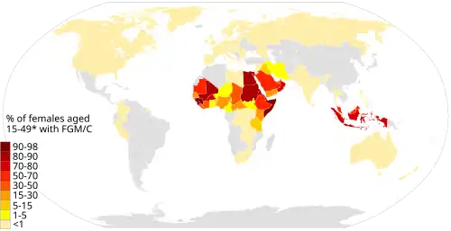 Map showing the % of women and girls aged 15–49 years (unless otherwise stated) who have undergone FGM/C according to the March 2020 Global Response report.[75] Grey countries' data are not covered.