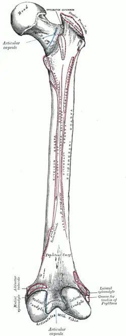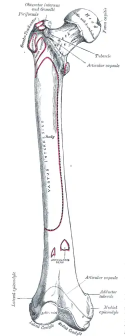 - ^ a b Chang A, Breeland G, Black AC, Hubbard JB (17 November 2023). "Anatomy, Bony Pelvis and Lower Limb: Femur". StatPearls, US National Library of Medicine. Retrieved 24 September 2025.