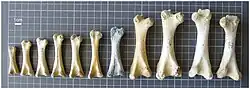 Some species of whales,[12] snakes, and other non-walking vertebrates have vestigial femurs. In some snakes, the protruding end of a pelvic spur, a vestigial pelvis and femur remnant which is not connected to the rest of the skeleton, plays a role in mating. This role in mating is hypothesized to have possibly occurred in Basilosauridae, an extinct family of whales with well-defined femurs, lower legs and feet. Occasionally, the genes that code for longer extremities cause a modern whale to develop miniature legs (atavism).[13]