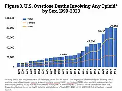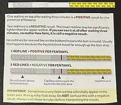 Fentanyl is contributing to an epidemic of synthetic opioid drug overdose deaths in the United States. From 2011 to 2021, deaths from prescription opioid (natural and semi-synthetic opioids and methadone) per year remained stable, while synthetic opioid (primarily fentanyl) deaths per year increased from 2,600 overdoses to 70,601.[26] Since 2018, fentanyl and its analogues have been responsible for most drug overdose deaths in the United States, causing over 71,238 deaths in 2021.[27][26][28] Fentanyl constitutes the majority of all drug overdose deaths in the United States since it overtook heroin in 2018.[27] The United States National Forensic Laboratory estimates fentanyl reports by federal, state, and local forensic laboratories increased from 4,697 reports in 2014 to 117,045 reports in 2020.[29] Fentanyl is often mixed, cut, or ingested alongside other drugs, including cocaine and heroin.[29] Fentanyl has been reported in pill form, including pills mimicking pharmaceutical drugs such as oxycodone.[29] Mixing with other drugs or disguising as a pharmaceutical makes it difficult to determine the correct treatment in the case of an overdose, resulting in more deaths.[18] In an attempt to reduce the number of overdoses from taking other drugs mixed with fentanyl, drug testing kits, strips, and labs are available.[30][31] Fentanyl's ease of manufacture and high potency makes it easier to produce and smuggle, resulting in fentanyl replacing other abused narcotics and becoming more widely used.
