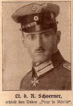 Schörner was born on 12 June 1892 in Munich, Kingdom of Bavaria, German Empire. He entered the Bavarian Army in October 1911 as a one-year volunteer with the Bavarian Leib Regiment, and by November 1914 he was a Leutnant der Reserve.[3] Serving in World War I, he was awarded the Pour le Mérite military order as a lieutenant when he took part in the Battle of Caporetto, which shattered the Italian lines in autumn 1917. Continuing in the Reichswehr, between the two wars, Schörner served as a staff officer and instructor. In 1923 he was adjutant to General Otto von Lossow, the commander of Wehrkreis VII (military district) in Munich and participated in the defeat of the Beer Hall Putsch.[4]