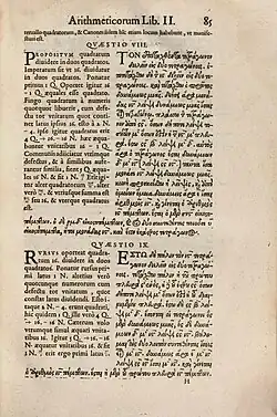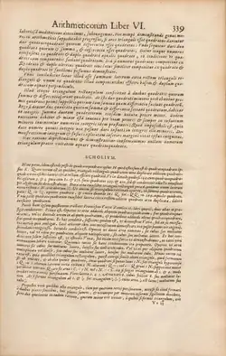 Diophantus's major work is the Arithmetica, of which only a portion has survived.[22] Fermat's conjecture of his Last Theorem was inspired while reading a new edition of the Arithmetica,[23] that was translated into Latin and published in 1621 by Claude Bachet.[24][25]